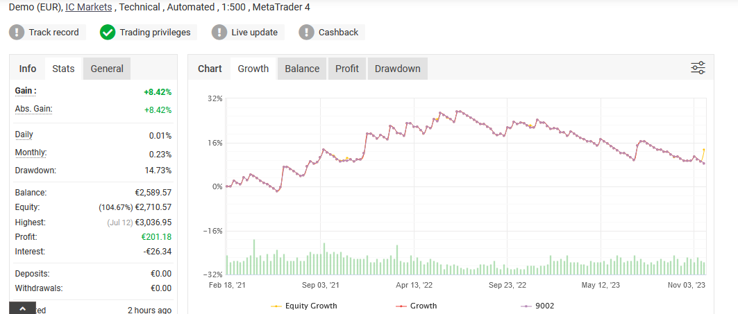 An dem EA können sich die anderen mal ein Beispiel nehmen! So wollen wir die EAs sehen, oder?! Mit 7,86% Performance und nur 1,88% Drawdown begeistert er doch sehr. Das macht sich dann im Chart bemerkbar mit einem beständigen Anstieg. Schwere Krise kann er offenbar!