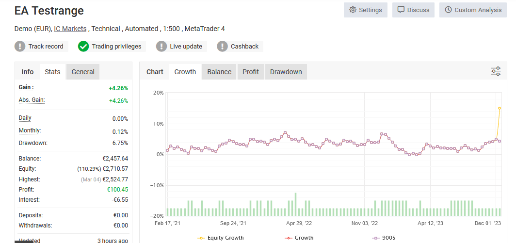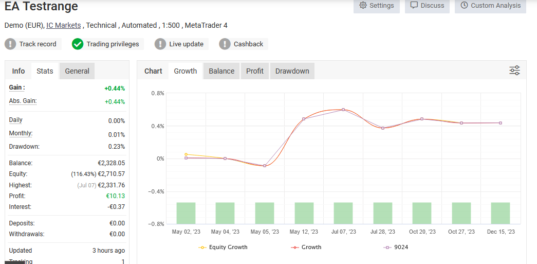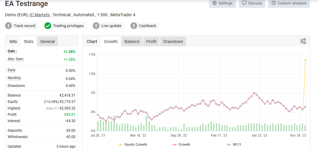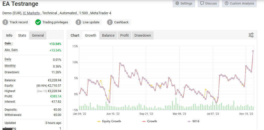 Hoppla! Der Bursche neigt zu einem wilden Ritt! Das muss man mögen. Obwohl er eine Performance von 13,54% hat, hat er aber auch einen Drawdown von 11,26%. Das ist beides noch okay. Er ist aber im Vergleich zu den vorher analysierten Expert Advisor auch ein Jahr weniger gelaufen. Also jünger. Geben wir ihm also eine Chance und schauen nächstes Jahr, was aus ihm geworden ist.